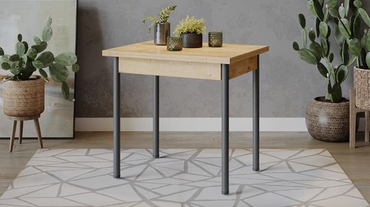 Стол имеет поворотно-раскладной механизм трансформации. Длина стола увеличивается вдвое: для этого нужно развернуть столешницу на 90 градусов и опустить верхнее крыло.