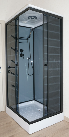 - Комплектация: поддон 15 см с бортиком, черный профиль, черные дуги, черный ручной душ с держателем и гибким шлангом, тропический душ, черная стеклянная полка, черный смеситель, ролики, ручки, магнит на двери;