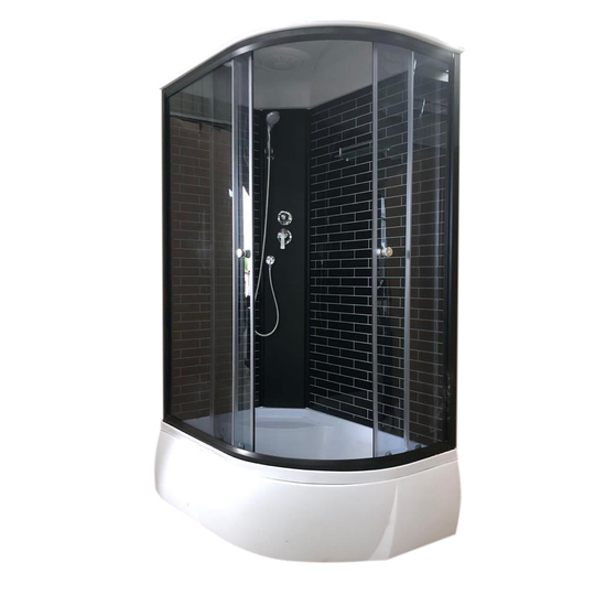 - Комплектация: поддон 42 см с бортиком, черный профиль, черные дуги, черная панель, тропический душ, ручной душ с держателем, стеклянная полка, смеситель, сифон;