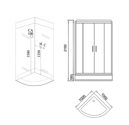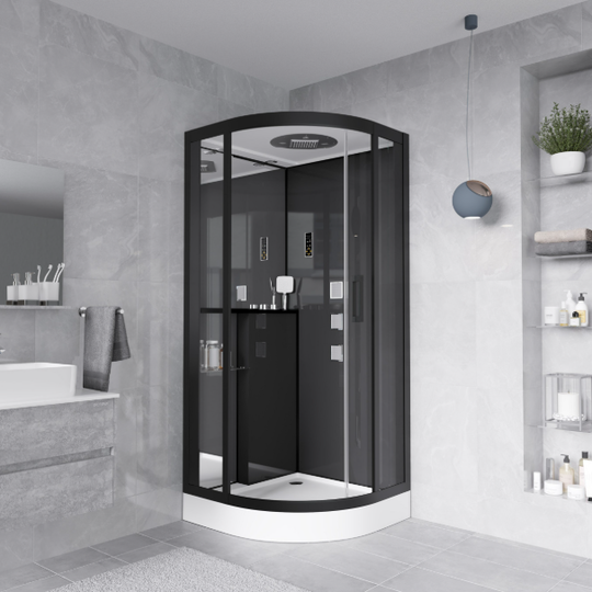 черный профиль, поддон 15 см, стекло 5 мм, раздвижные двери, радио, вентилятор, динамик, верхний свет, верхний душ, ручной душ, 2 полочки, гидромассаж 3 форсунки, зеркало, пластиковая ручка