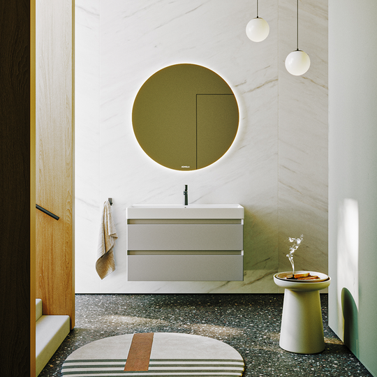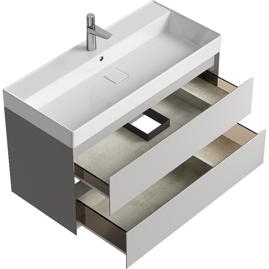 Тумба Aqwella Geometria 100 оснащена двумя выдвижными ящиками на направляющих скрытого монтажа, что обеспечивает плавное скольжение и мягкое закрывание. Фасады и боковины с обработкой торцов под углом 45 градусов создают лаконичность и изящный, почти монолитный силуэт в закрытом состоянии. Все грани имеют округлую фрезеровку, обеспечивая приятные тактильные ощущения при открывании. Внутри ящиков - отделка под светлый камень, боковины выполнены из толстого тонированного стекла, что добавляет коллекции элегантности.