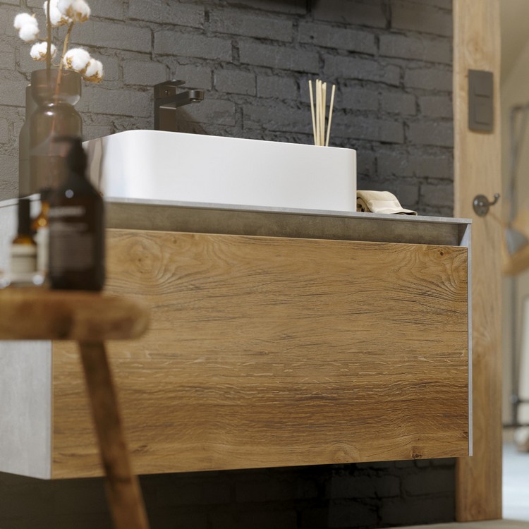 Тумба Mobi 60 оснащена двумя ящиками: основным и внутренним, скрытым за фасадом. Направляющие ящиков обеспечивают плавное и мягкое закрывание. Внутренний ящик тумб укомплектован пластиковым разделителем для хранения различных мелочей. Внутренняя отделка ящиков комбинированная: боковины – цвет бетон светлый, дно – дуб балтийский. В комплект тумбы Mobi входит специальный сифон, позволяющий экономить пространство мебели. Фасады, боковины и столешницы из МДФ толщиной всего 10 мм. Подходит любой наставной умывальник. При этом умывальник может устанавливаться в любом месте, а не только центру. Коллекция оснащена итальянскими навесами Camar, которые выдерживают нагрузку до 200 кг.