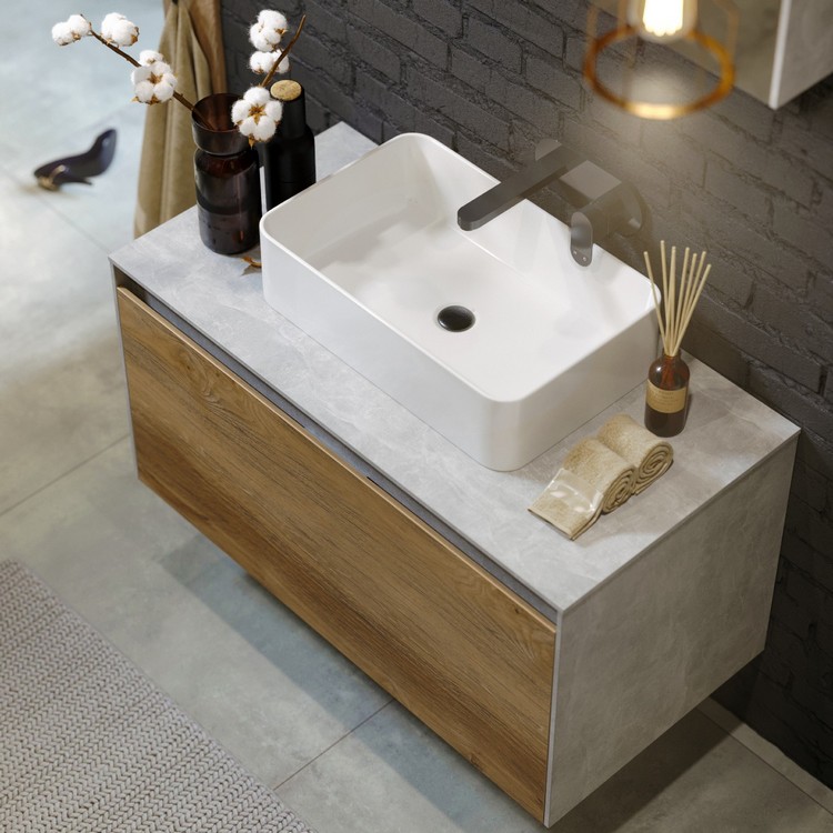 • Корпус тумбы 60 цвет "бетон светлый" + фасад тумбы 60 цвет "дуб балтийский" + керамическая раковина Kirovit Олимпия 56.