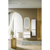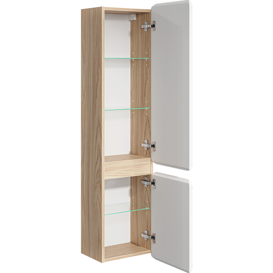 Созданная в стиле софт-минимализма, коллекция Vento отличается мягкой геометрией и визуальной тишиной. Скругленные фасады окрашены матовой краской, также они выполняют функцию скрытых ручек. Древесный корпус из ЛДСП в оттенке светлой акации. Пенал Aqwella Vento 35 оснащен двумя дверцами, комплектуется тремя стеклянными полочками.