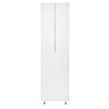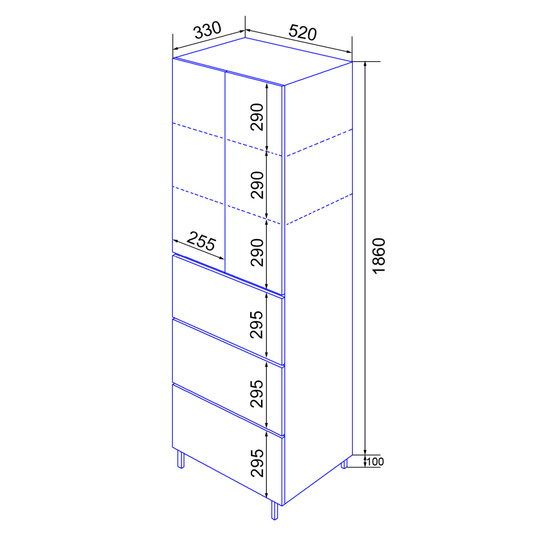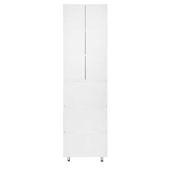 Пенал Azario Эстима оснащен двумя распашными фасадами на доводчиках, за которыми спрятаны две полочки, и тремя выдвижными ящиками без доводчиков. Пенал установлен на хромированные ножки. Корпус изготовлен из ЛДСП, фасады МДФ толщиной 16 мм. Корпус и фасады производства Kronospan. Бока и фасады крашеные итальянской эмалью.