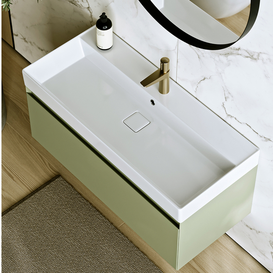 Тумба Aqwella Geometria 100 оснащена одним выдвижным ящиком на направляющих скрытого монтажа, что обеспечивает плавное скольжение и мягкое закрывание. Фасады и боковины с обработкой торцов под углом 45 градусов создают лаконичность и изящный, почти монолитный силуэт в закрытом состоянии. Все грани имеют округлую фрезеровку, обеспечивая приятные тактильные ощущения при открывании. Внутри ящиков - отделка под светлый камень, боковины выполнены из толстого тонированного стекла, что добавляет коллекции элегантности.
