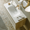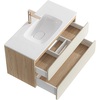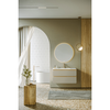 Созданная в стиле софт-минимализма, коллекция Vento отличается мягкой геометрией и визуальной тишиной. Скругленные фасады окрашены матовой краской, также они выполняют функцию скрытых ручек. Древесный корпус из ЛДСП в оттенке светлой акации. Тумбы Vento оснащены умывальниками Malaga из литьевого мрамора, сочетающими четкую геометрию с мягкой пластикой линий. Глубокая практичная чаша обеспечивает комфортность в использовании, а декоративная заглушка в сливной зоне сохраняет чистоту поверхности и архитектурную строгость. Внутреннее пространство продумано до мелочей: дно ящиков выполнено в цвет корпуса, а в верхний ящик установлена система организации внутреннего пространства в виде трех перегородок из ЛДСП.