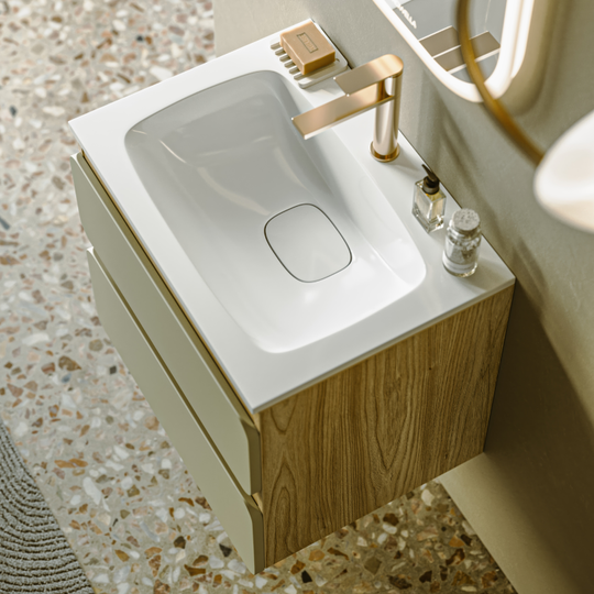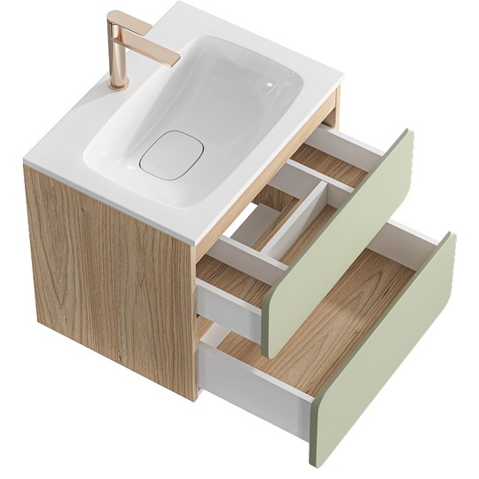 Созданная в стиле софт-минимализма, коллекция Vento отличается мягкой геометрией и визуальной тишиной. Скругленные фасады окрашены матовой краской, также они выполняют функцию скрытых ручек. Древесный корпус из ЛДСП в оттенке светлой акации. Тумбы Vento оснащены умывальниками Malaga из литьевого мрамора, сочетающими четкую геометрию с мягкой пластикой линий. Глубокая практичная чаша обеспечивает комфортность в использовании, а декоративная заглушка в сливной зоне сохраняет чистоту поверхности и архитектурную строгость. Внутреннее пространство продумано до мелочей: дно ящиков выполнено в цвет корпуса, а в верхний ящик установлена система организации внутреннего пространства в виде трех перегородок из ЛДСП.