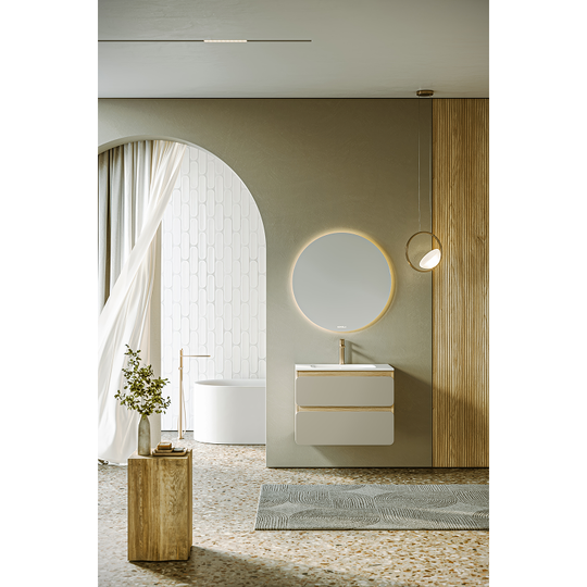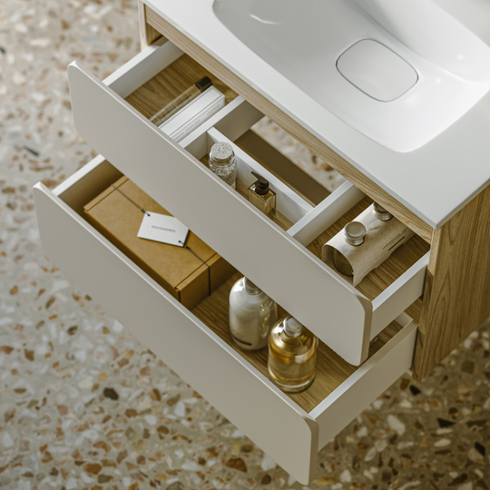 Созданная в стиле софт-минимализма, коллекция Vento отличается мягкой геометрией и визуальной тишиной. Скругленные фасады окрашены матовой краской, также они выполняют функцию скрытых ручек. Древесный корпус из ЛДСП в оттенке светлой акации. Тумбы Vento оснащены умывальниками Malaga из литьевого мрамора, сочетающими четкую геометрию с мягкой пластикой линий. Глубокая практичная чаша обеспечивает комфортность в использовании, а декоративная заглушка в сливной зоне сохраняет чистоту поверхности и архитектурную строгость. Внутреннее пространство продумано до мелочей: дно ящиков выполнено в цвет корпуса, а в верхний ящик установлена система организации внутреннего пространства в виде трех перегородок из ЛДСП.