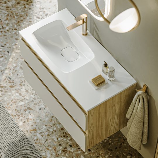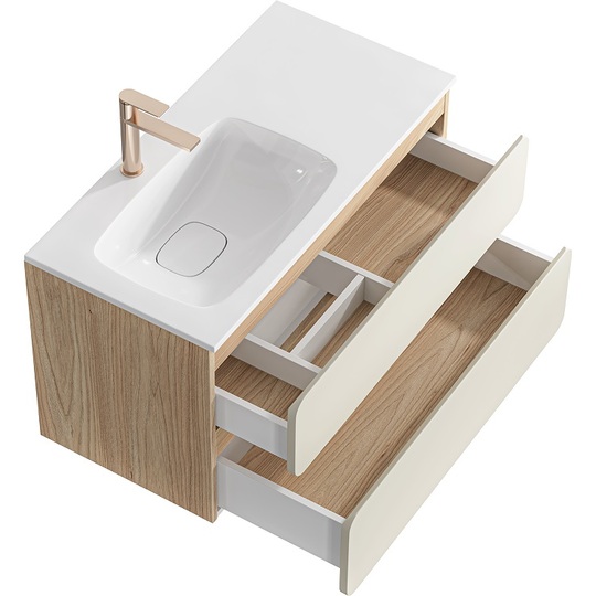 Созданная в стиле софт-минимализма, коллекция Vento отличается мягкой геометрией и визуальной тишиной. Скругленные фасады окрашены матовой краской, также они выполняют функцию скрытых ручек. Древесный корпус из ЛДСП в оттенке светлой акации. Тумбы Vento оснащены умывальниками Malaga из литьевого мрамора, сочетающими четкую геометрию с мягкой пластикой линий. Глубокая практичная чаша обеспечивает комфортность в использовании, а декоративная заглушка в сливной зоне сохраняет чистоту поверхности и архитектурную строгость. Версия тумбы 90 см с асимметричным умывальником, смещенным влево, благодаря чему все необходимое под рукой. Внутреннее пространство тумбы продумано до мелочей: дно ящиков выполнено в цвет корпуса, а в верхний ящик установлена система организации внутреннего пространства в виде трех перегородок из ЛДСП.