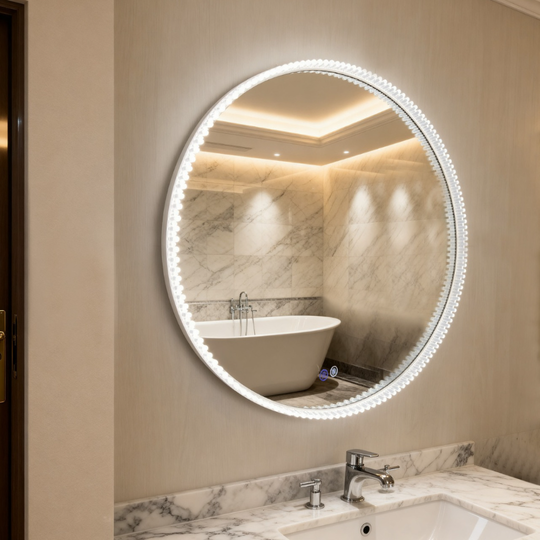 с декоративной подсветкой и диммером, подогрев (антизапотевание), бесконтактный сенсор